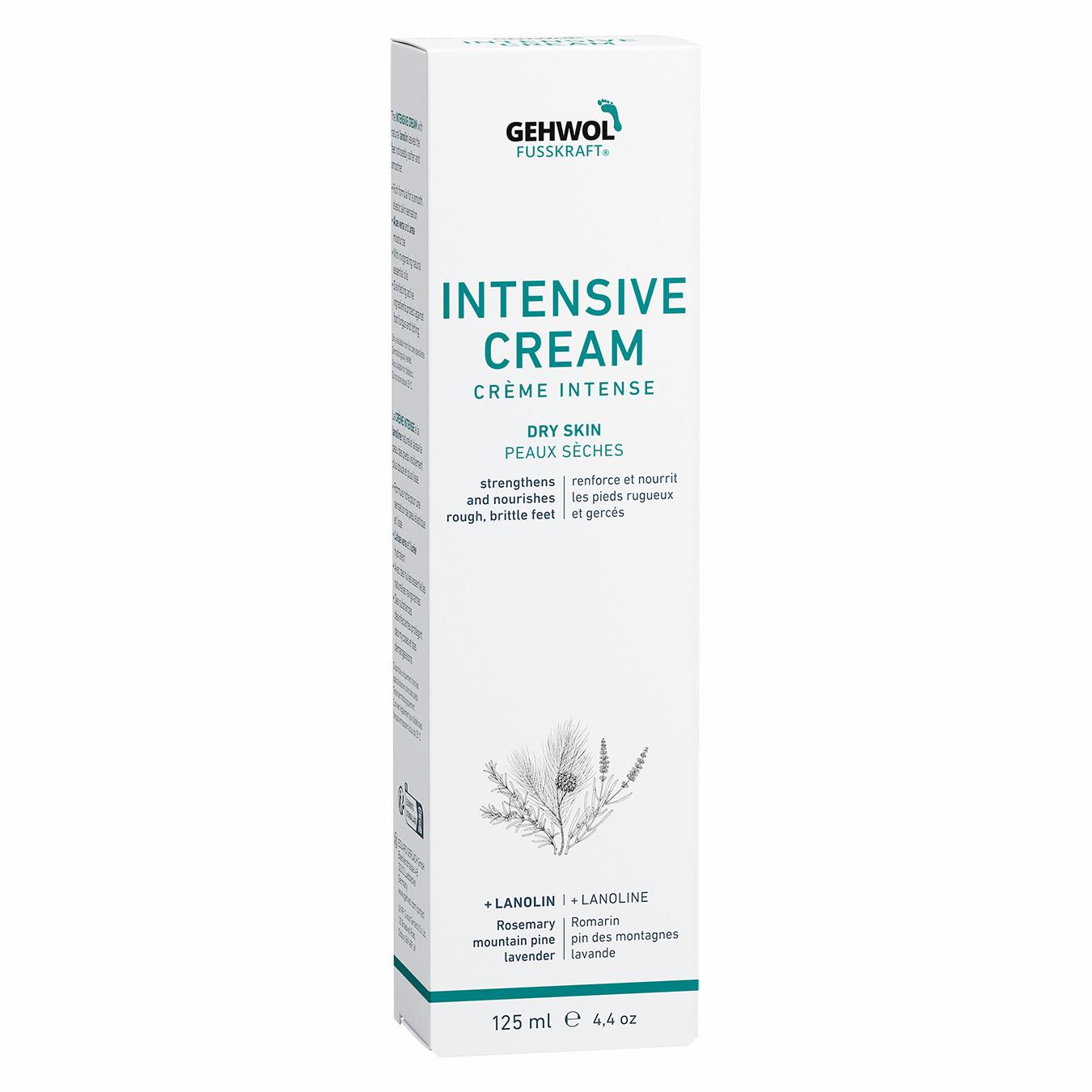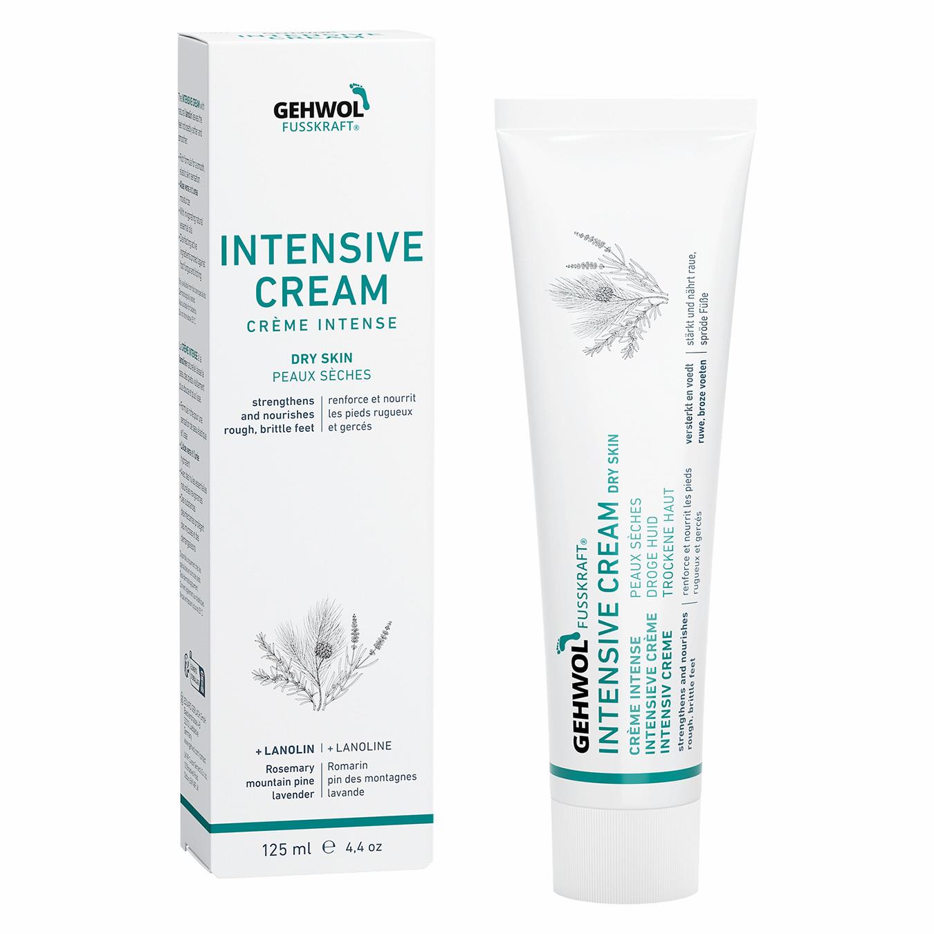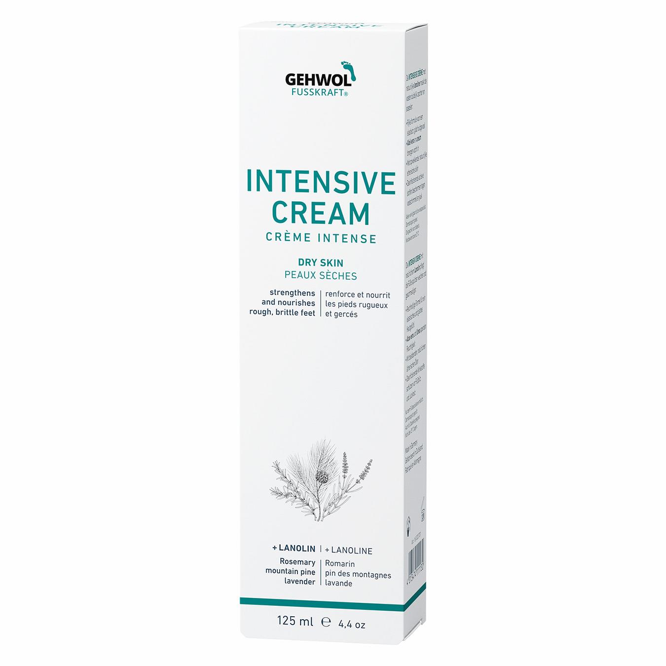 Fuktighetsgivande, naturligt frisk vård för torr och skör hud med beprövade beståndsdelar för att förhindra lukt, fotsvamp och klåda mellan tårna. Naturliga och hudvänliga fetter, som t.ex lanolin i kombination med den fuktighetsgivande Aloe Vera och karbamid ger den torra, spröda huden på fötterna den nödvändiga vården och gör dem åter elastiska, smidiga och mjuka. De eteriska oljorna Rosmarin, bergtall, lavendel såväl som kamfer och menthol som finns i Gehwol Fusskraft Intensive Cream lindrar brännande fötter och fotsmärtor.