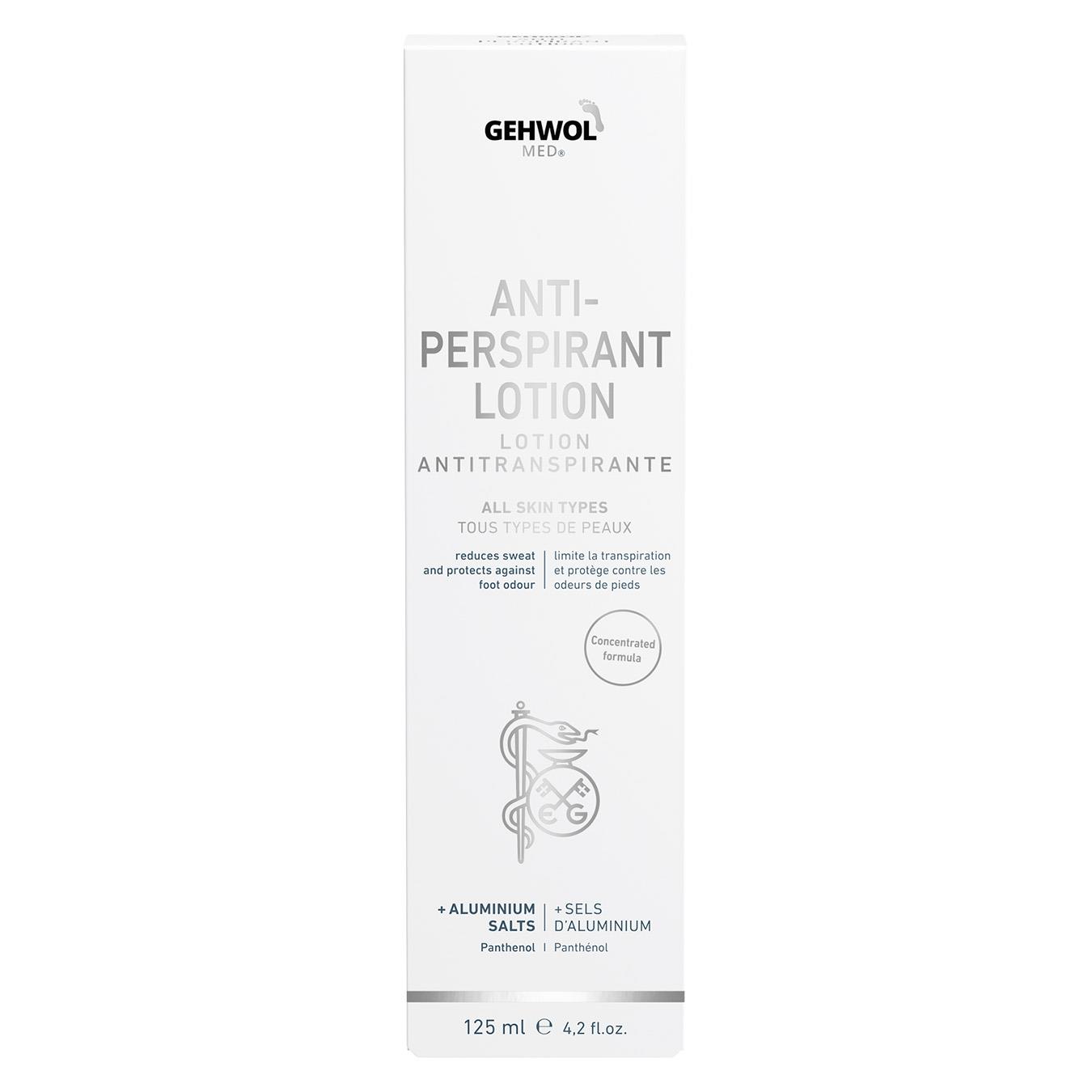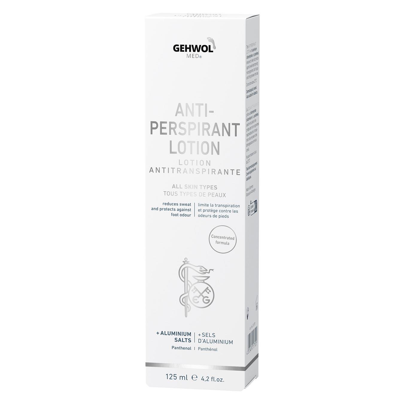 Gehwol med® Antitranspirant är en kräm som vid regelbunden användning leder till torrare och luktfria fötter. Foten skyddas mot svettnedbrytande mikroorganismer, fotsvamp och klåda mellan tårna. Svettbildningen minskas och doftbildningen förhindras. Samtidigt motverkas sprödhet och en stark uttorkning av huden. GEHWOL med® Antitranspirant Cremelotion reducerar svett och skyddar mot fotsvettslukt. Aloe Vera, avocadoolja och glycerin vårdar huden. Aluminiumchlorohydrat reducerar svettbildningen. Zinkricinoleat tar bort lukt och Natrium-PCA skyddar huden mot uttorkning.