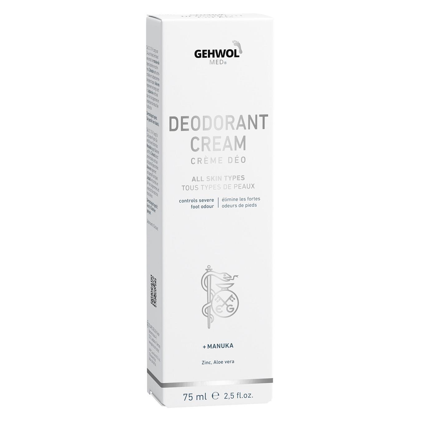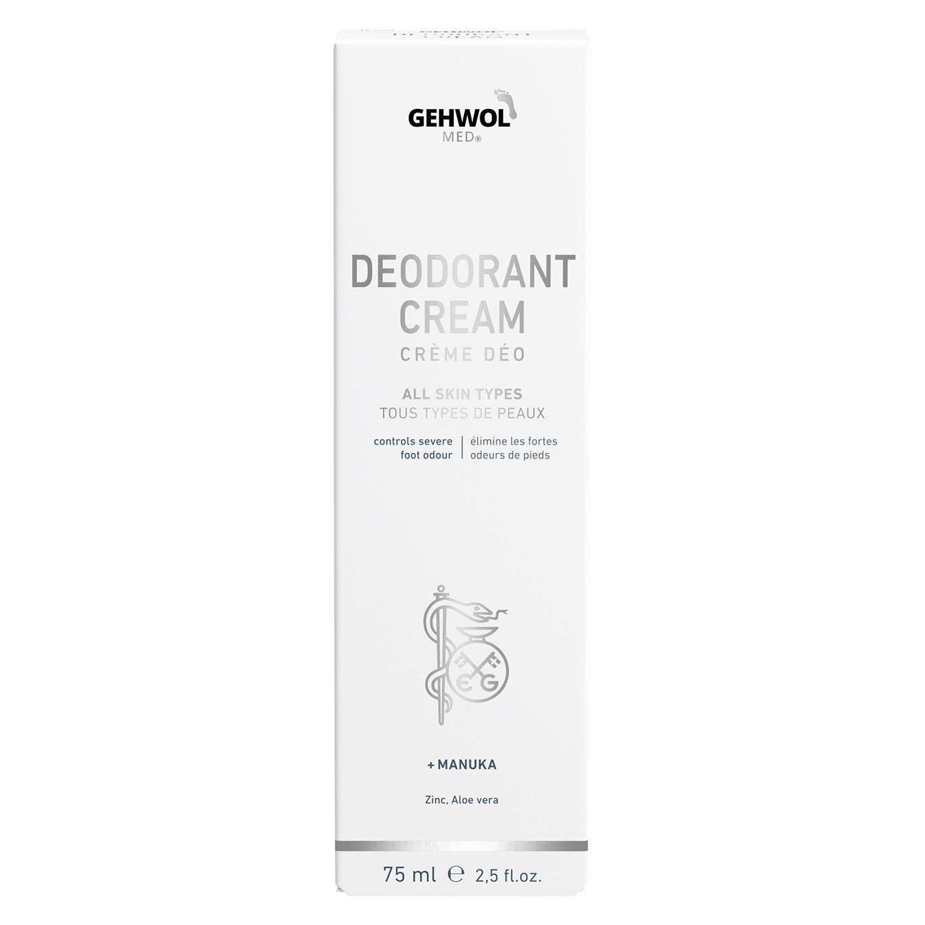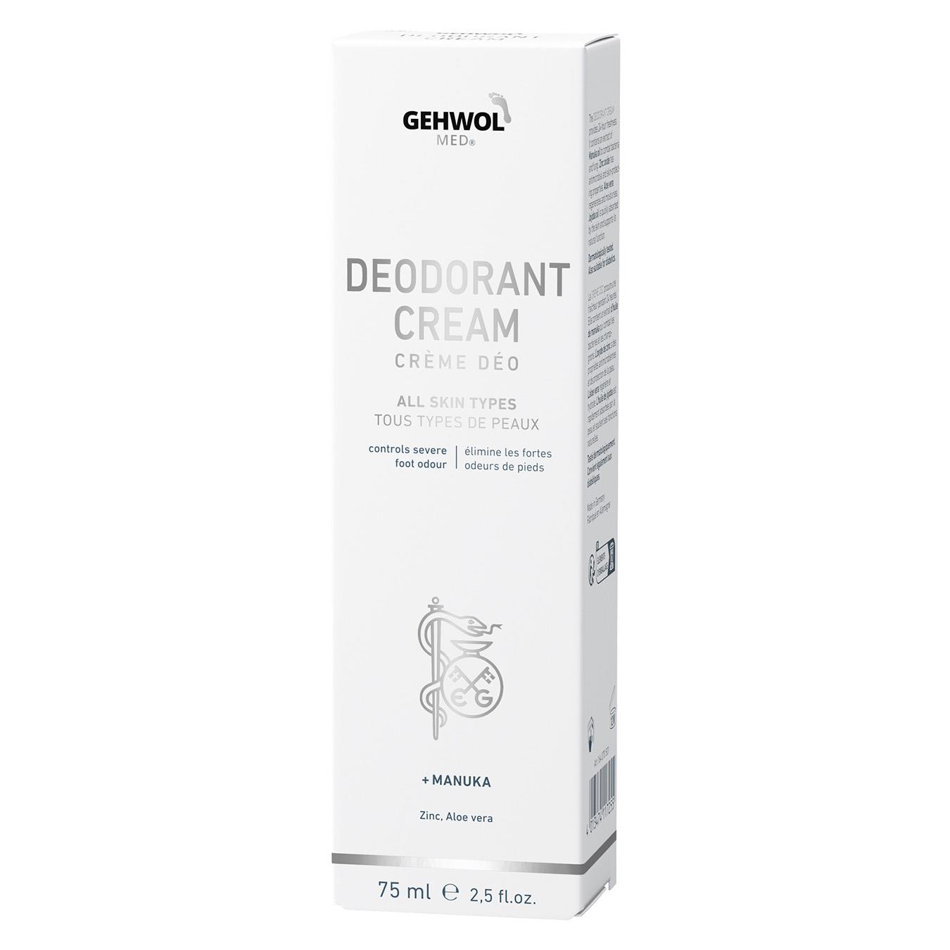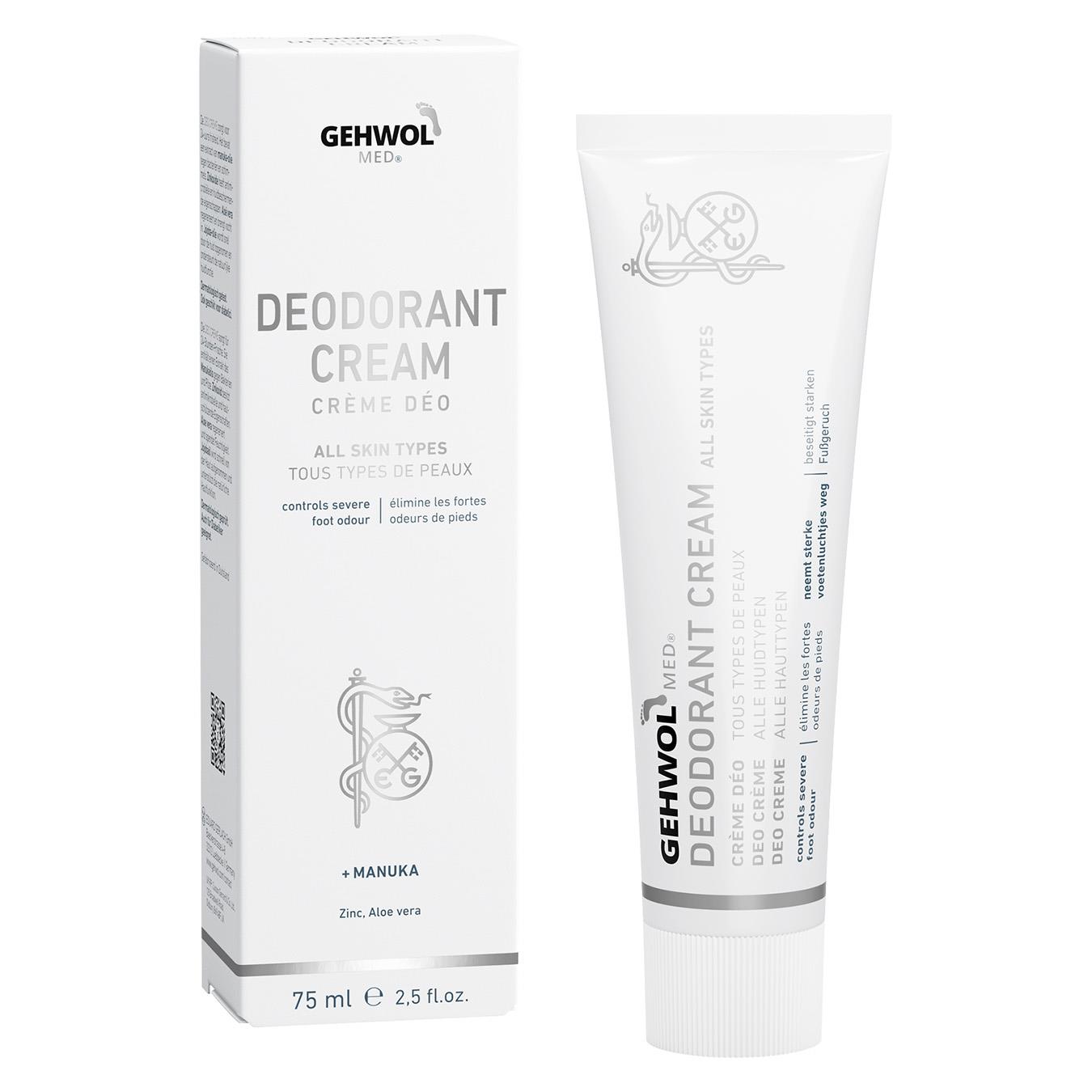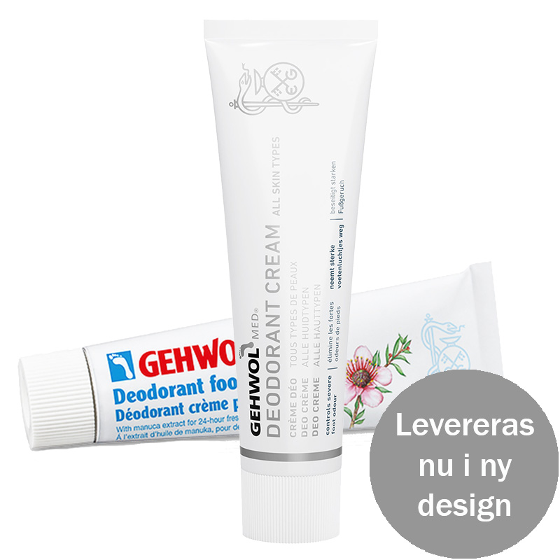 Gehwol med® Fussdeo-creme med angenäm doft som har en bas av jojobaolja och aloe vera. Denna kombineras med den höga koncentrationen av extrakt från Manuka-oljan med mikroniserad zinkoxid för att skydda foten mot stark fotlukt i minst 24 timmar. Tack vare att Manuka-oljans alla välkända substanser verkar mot svamp och bakterier, passar den utmärkt för fothygien. Zinkoxid i sin mikroniserade form är för vården av den ömtåliga huden en utmärkt substans med dess antimikrobiella och hudskyddande egenskaper. Aloe vera verkar bakteriostatiskt, inflammationshämmande, regenererande och fuktgivande. Jojobaolja tas lätt upp av huden. Den innehåller värdefulla, fleromättade fettsyror och stöder de naturliga hudfunktionerna. Vid regelbunden användning av denna mildfettande creme blir foten luktfri, huden blir fräsch och man får dessutom ett skydd mot fotsvamp.