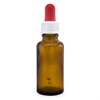 Brun glasflaska med pipettrör av glas, röd gummisug och vit skruvkork.